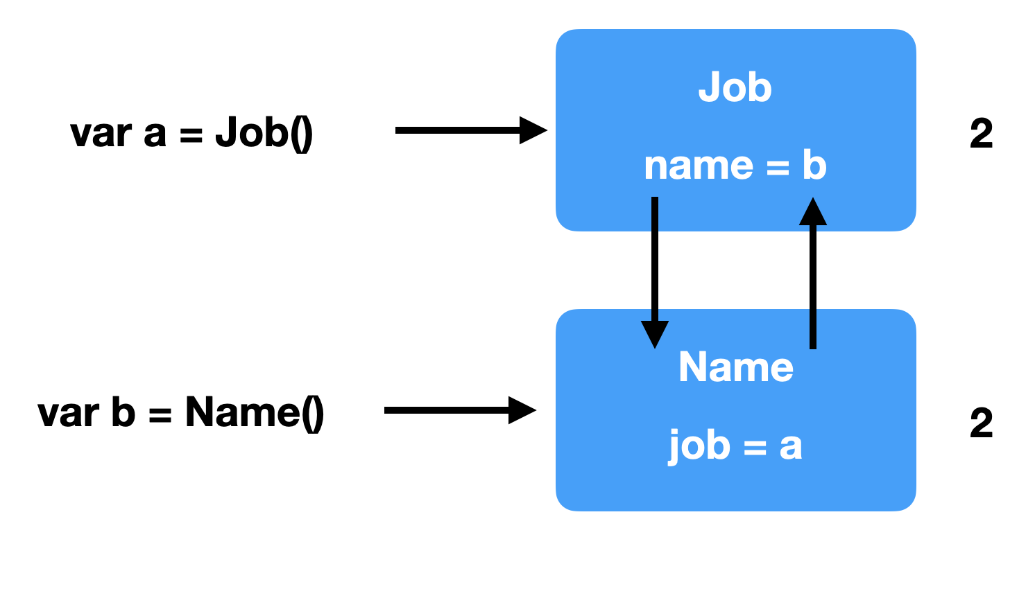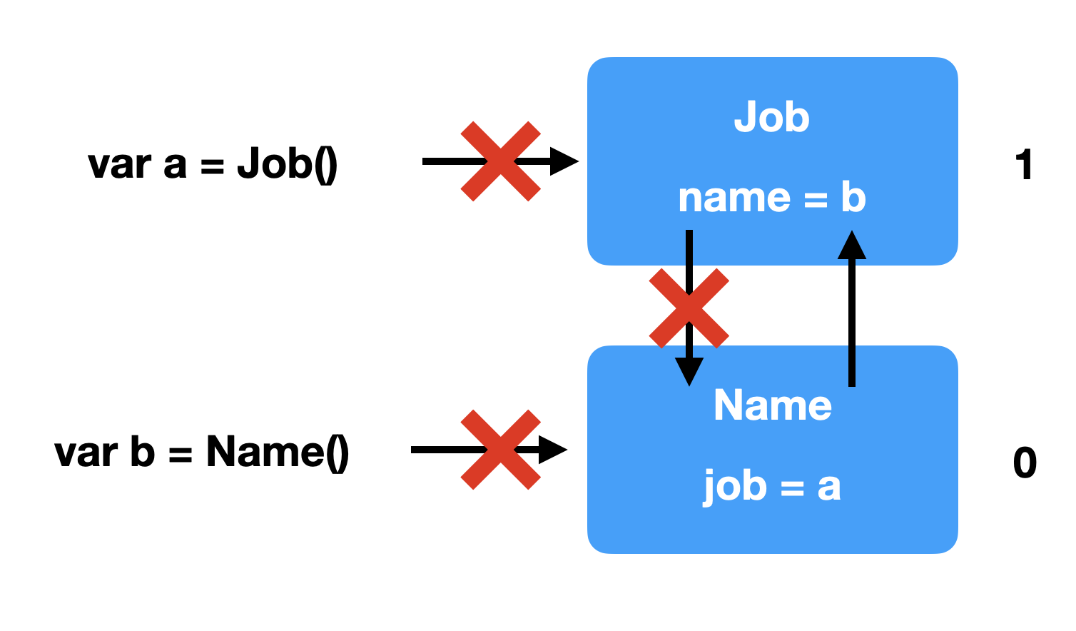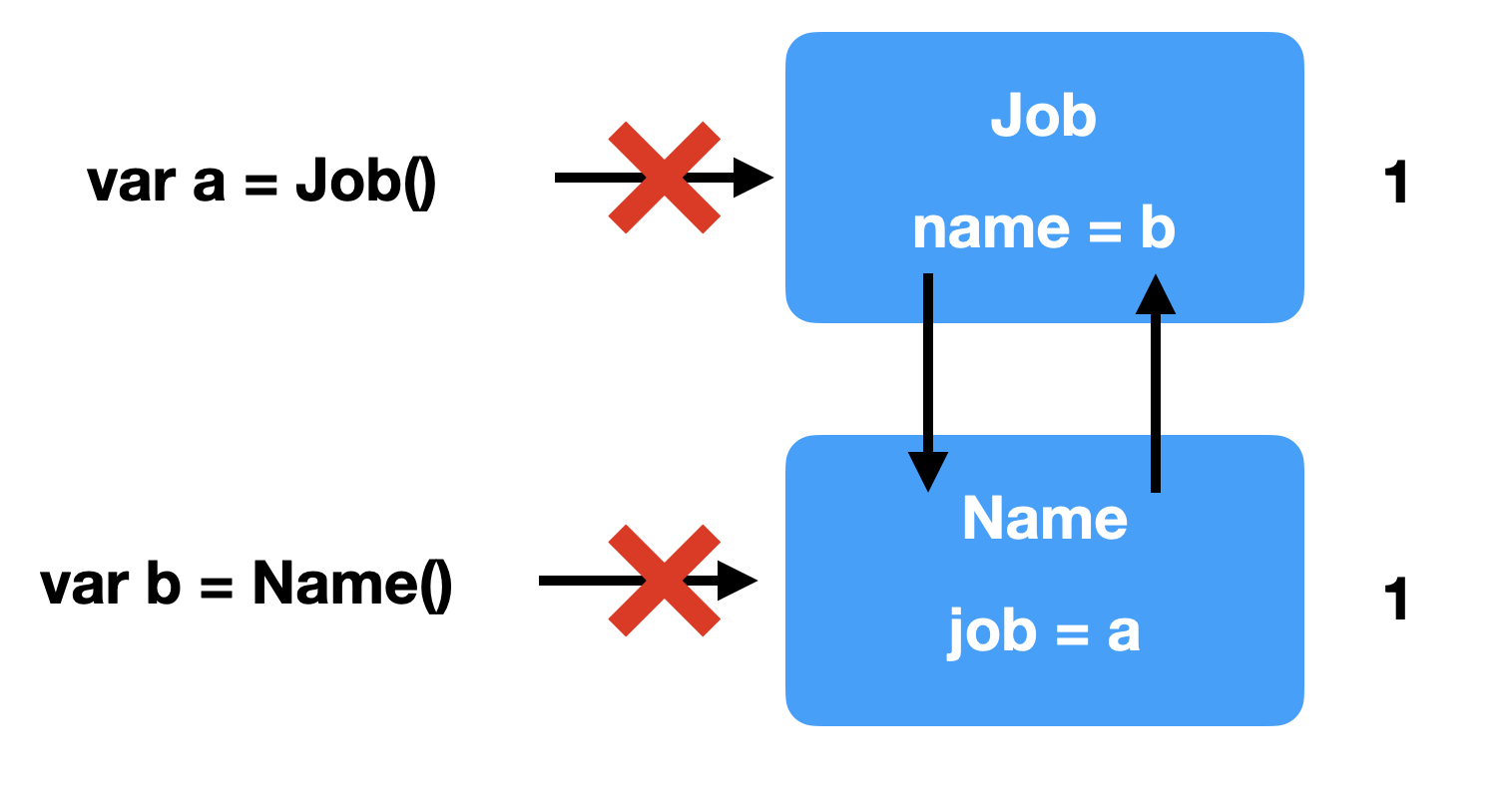 아무도 a가 가르키는 Job 객체와 b가 가르키는 Name객체에 접근할 수 없으니 deinit이 되어야 합니다.
