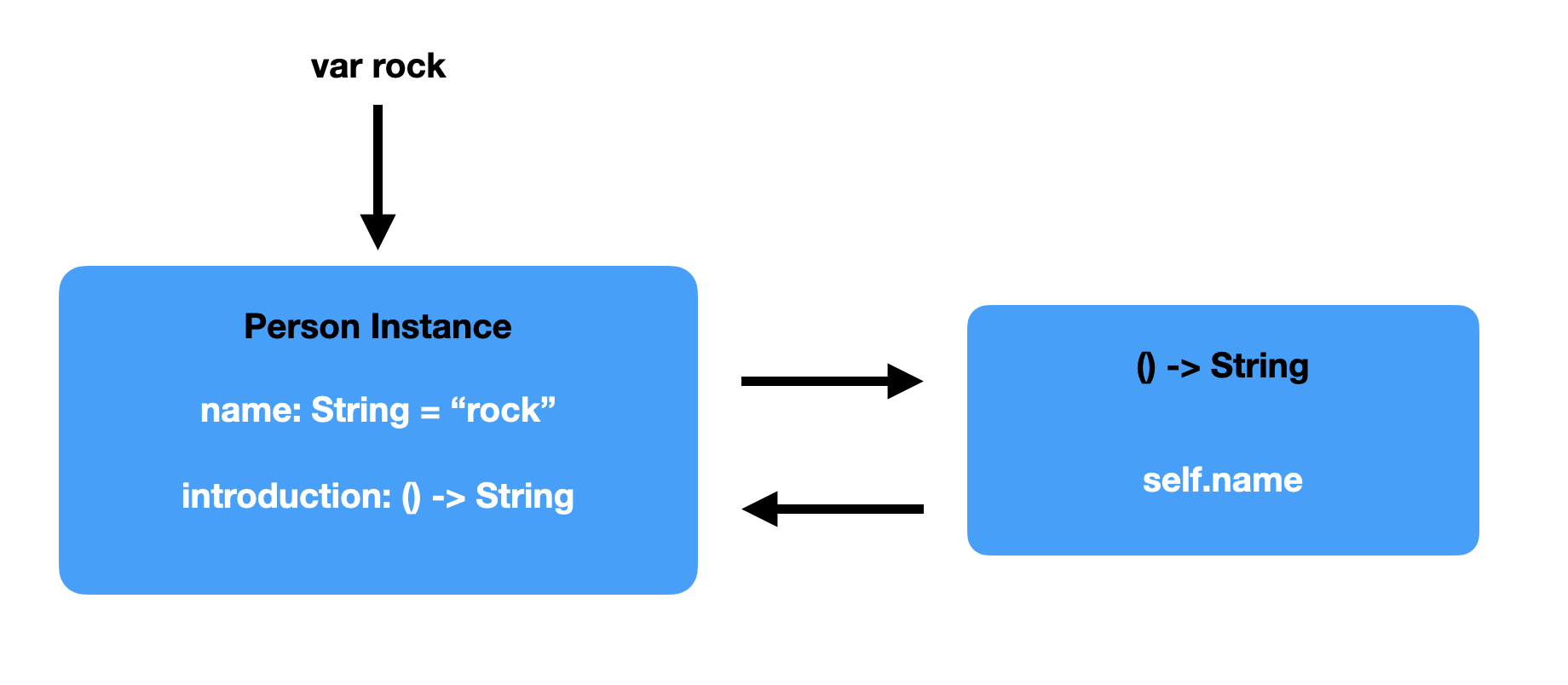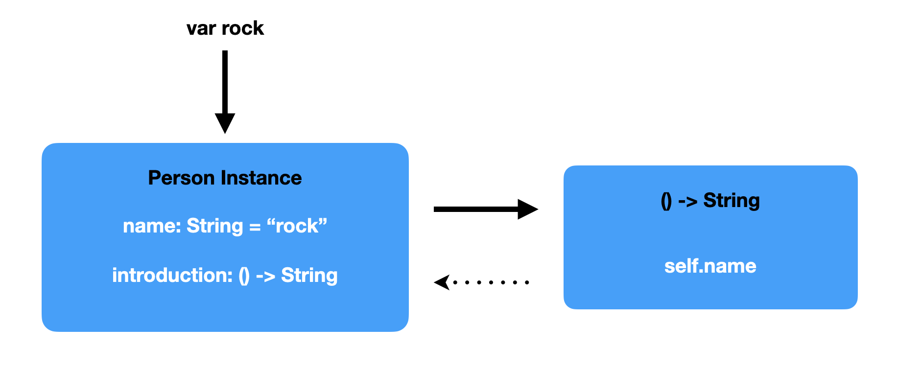 위 그림과 같이, Person객체를 변수 “rock”과 클로저가 참조하고 있습니다.