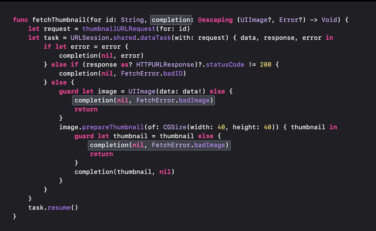 이때, 이미지를 서버로부터 다운로드 받을때 escaping closure가 호출됩니다. 그리고 받은 데이터를 가지고 다시 prepareThumnail이라는 함수를 호출해야 하고 이때 한번 더 closure가 호출됩니다.